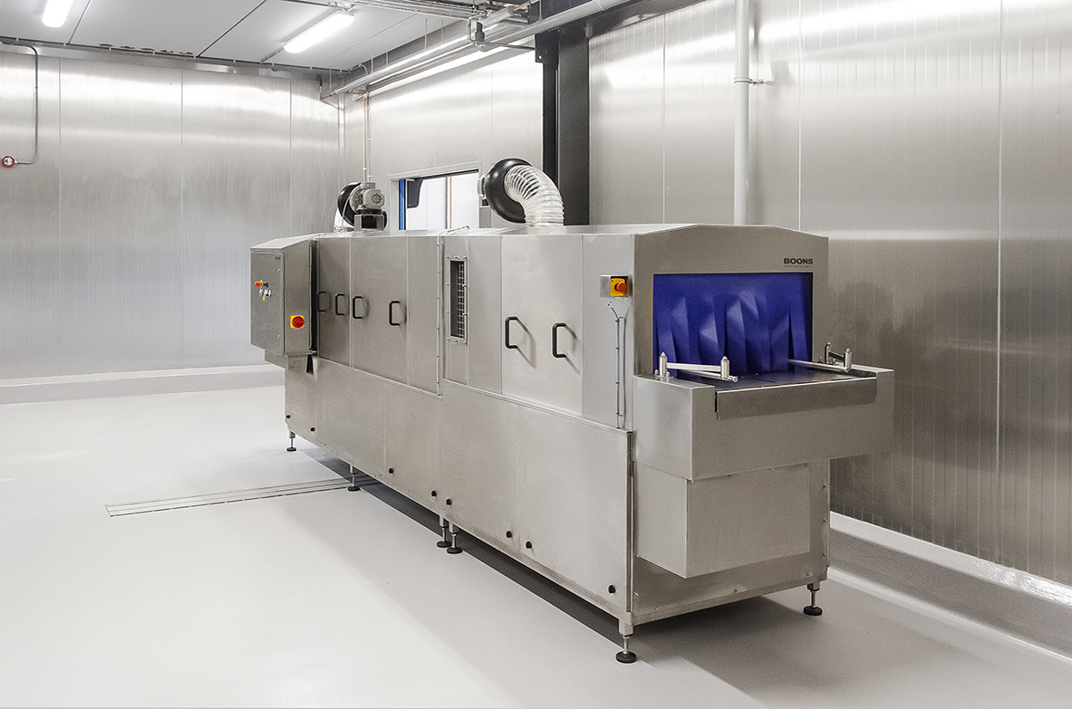 The capacity of this KWM600 is between 400 and 800 crates per hour, depending on the chosen composition and settings. Safety sensors prevent the pumps and heating elements from running dry. In the washing zone, the crates are cleaned with warm water and detergent. The filtered water from the washing process is returned to the water tank, where it is kept at the right temperature and pumped back to the washing nozzles.