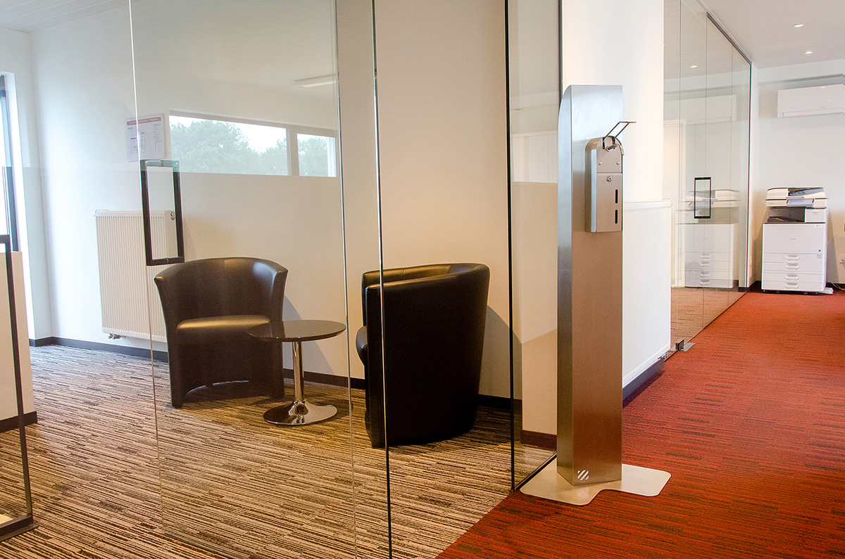 En option, ce distributeur peut aussi être monté sur une colonne en inox. Celle-ci est facile à utiliser et à déplacer. C'est donc la solution idéale pour offrir la désinfection des mains partout.