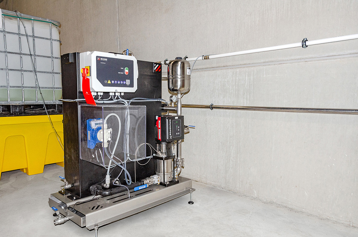 La pompe d'alimentation à régulation de fréquence de 7 bars pilote une pompe de dosage (de type Grundfos CRIE). Cette pompe de dosage est commandées par un pulsomètre et un débitmètre, assurent un dosage parfaitement précis.